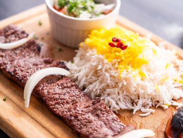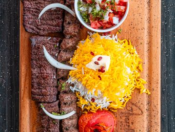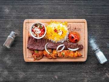 Koobideh kebab and Barg kebab served with rice, grilled tomato & salad