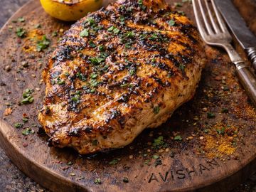 Grilled marinated chicken breast served with rice, grilled tomato & salad