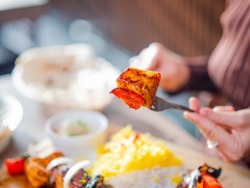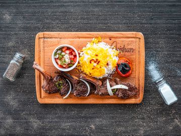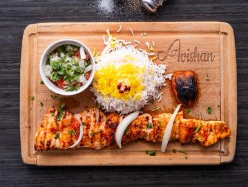 Grilled chicken kebab and Barg kebab served with rice, grilled tomato & salad