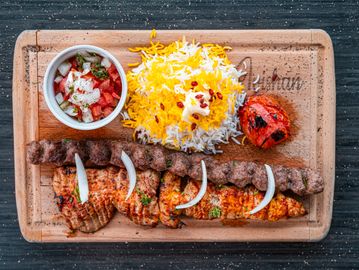 Koobideh kebab and grilled chicken kebab served with rice, grilled tomato & salad
